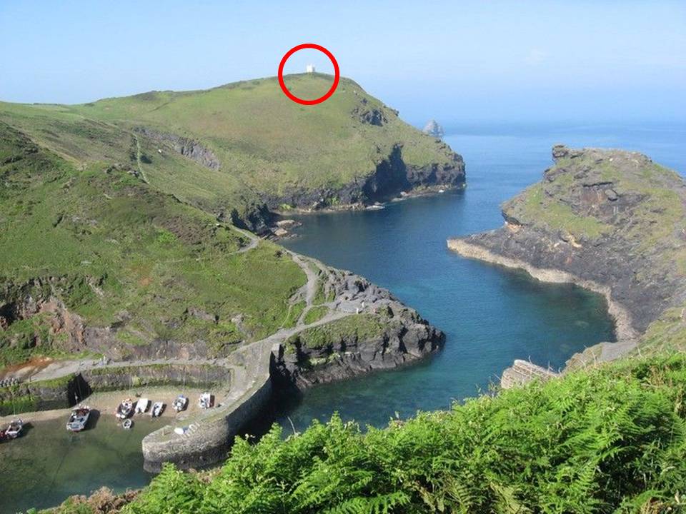 | The little building at the top of the hill is actually the coastguard lookout station on the south side of the harbour at Boscastle. |