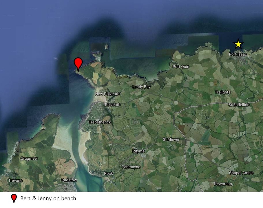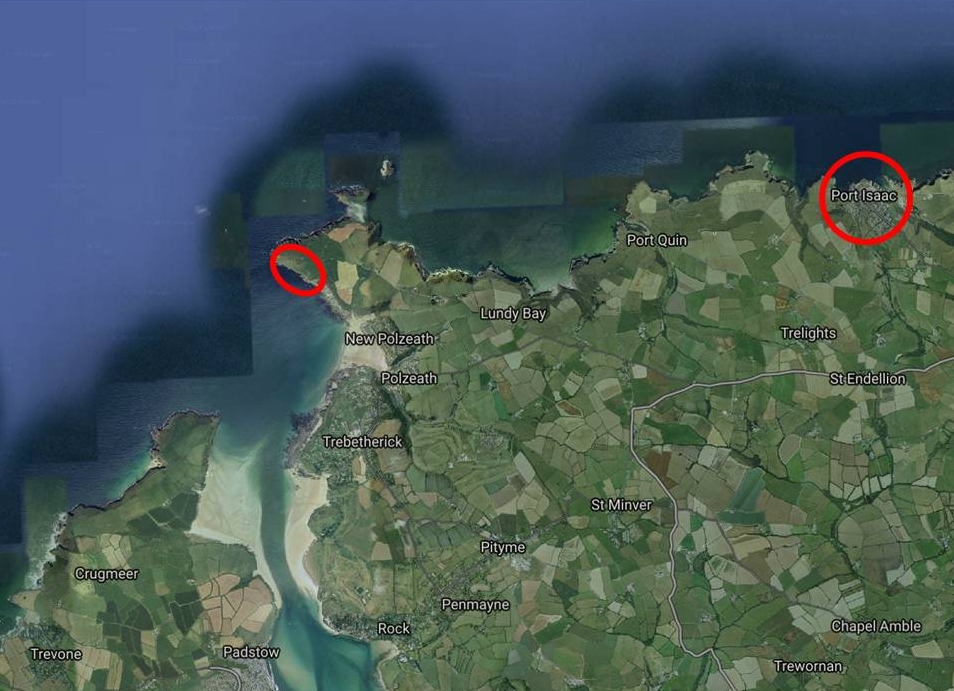 | Bert and Jenny have two scenes along the coast in this episode. In both scenes, they are at Pentire Point, along the coast, west of Port Isaac. You can see the stone tower at Stepper Point across the bay and parts of the towns of Polzeath and Trebetherick in the distance behind Jenny. |