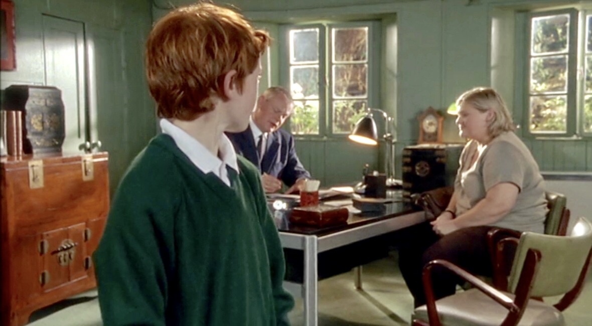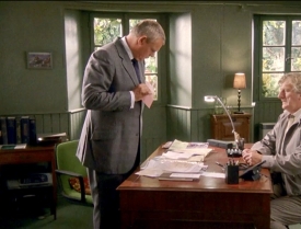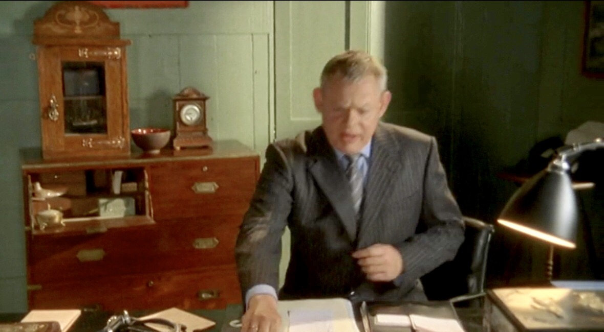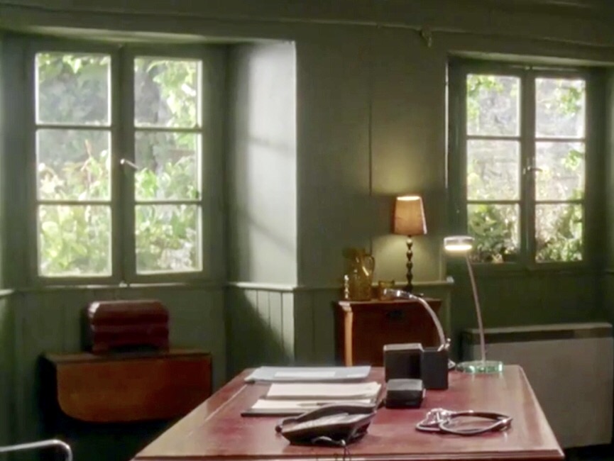 | The sketch of the boy is still on the wall. The drop-leaf table is still there at the beginning of Episode 1 and it now has the decorative wooden box that we have seen before behind Martin's desk. But during the episode it moves back and forth a couple of times over to the bay in the adjacent window. Starting in Episode 2 it stayed under the window for the rest of the series. |
