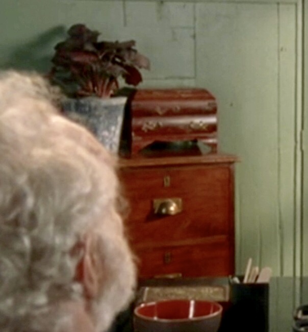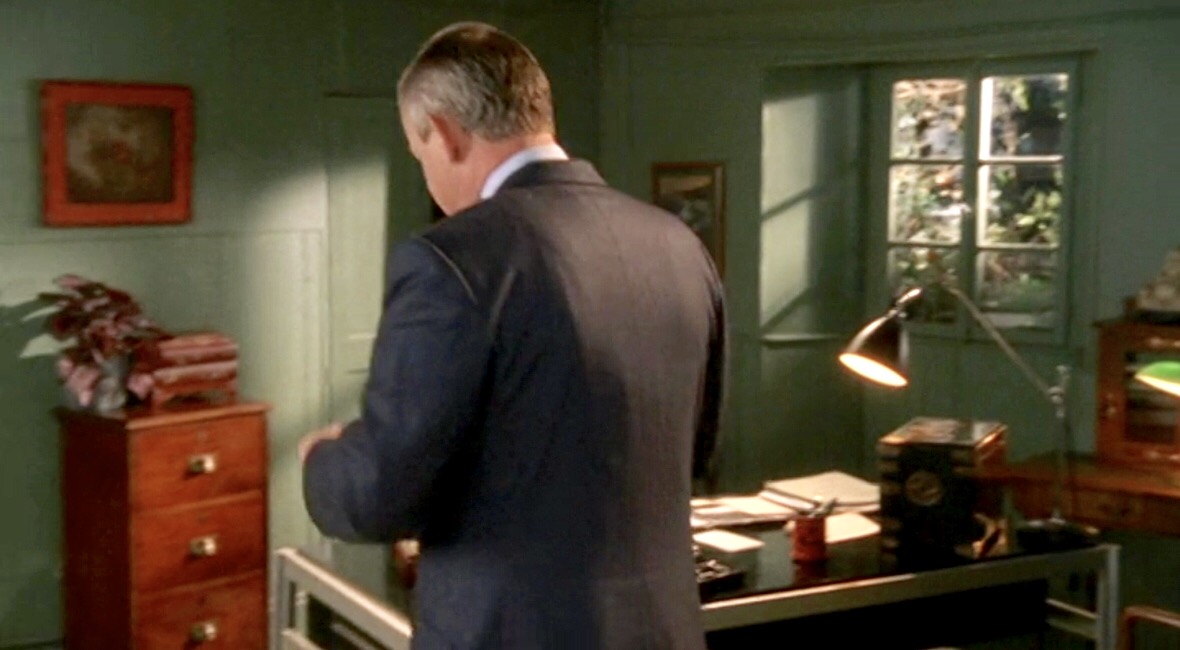 | In Episode 1, the drop-leaf table from the back left corner moves back and forth from there to under the left window. Starting in Episode 2 it remains under the window for the rest of the series and has the decorative wooden box on top. In the middle, the lamp remains on top of the secretary for the whole series, but moves from the left to the right starting in Episode 6. On the right is a wooden chair with a dark green leather seat But the glassware keeps changing all through the series. It starts out in Episode 1 with the light green glass pitcher from S5 back, but this time paired up with the light green glasses from S6. In Episodes 2, 3 & 4 the pitcher disappears and we only see the two glasses. Then, halfway through Episode 4, the green glasses disappear and are replaced by a heavy amber glass pitcher and matching glass. In Episode 5, the amber pieces are gone and the two green glasses are back. In Episode 6 the green glasses are gone and the amber pitcher and glass are back. Again, they're playing with us! |