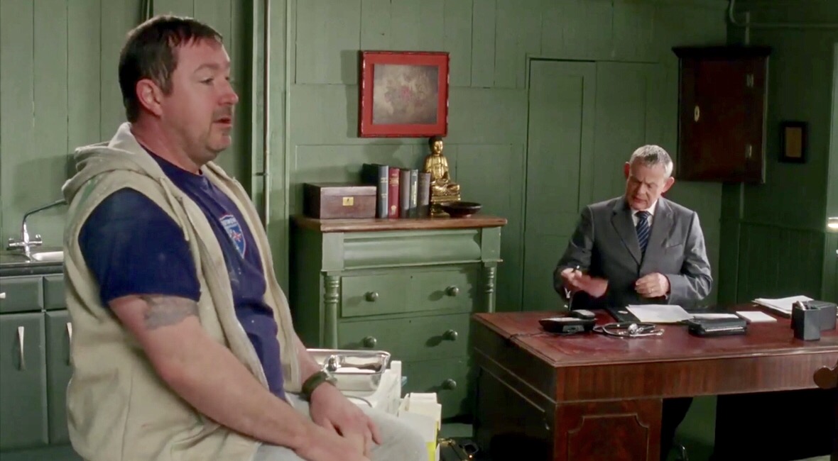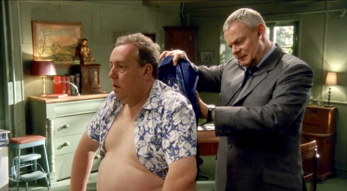 | I noticed something odd in Episode 8. When Martin was examining Clive for his arthritis, in some shots you can see the wooden corner cabinet, but others it looks like the cabinet isn't there. Notice how close the picture is to the cabinet in one shot and how much wall space is visible on the other one. The funny thing is this is all one scene - just different shots. |