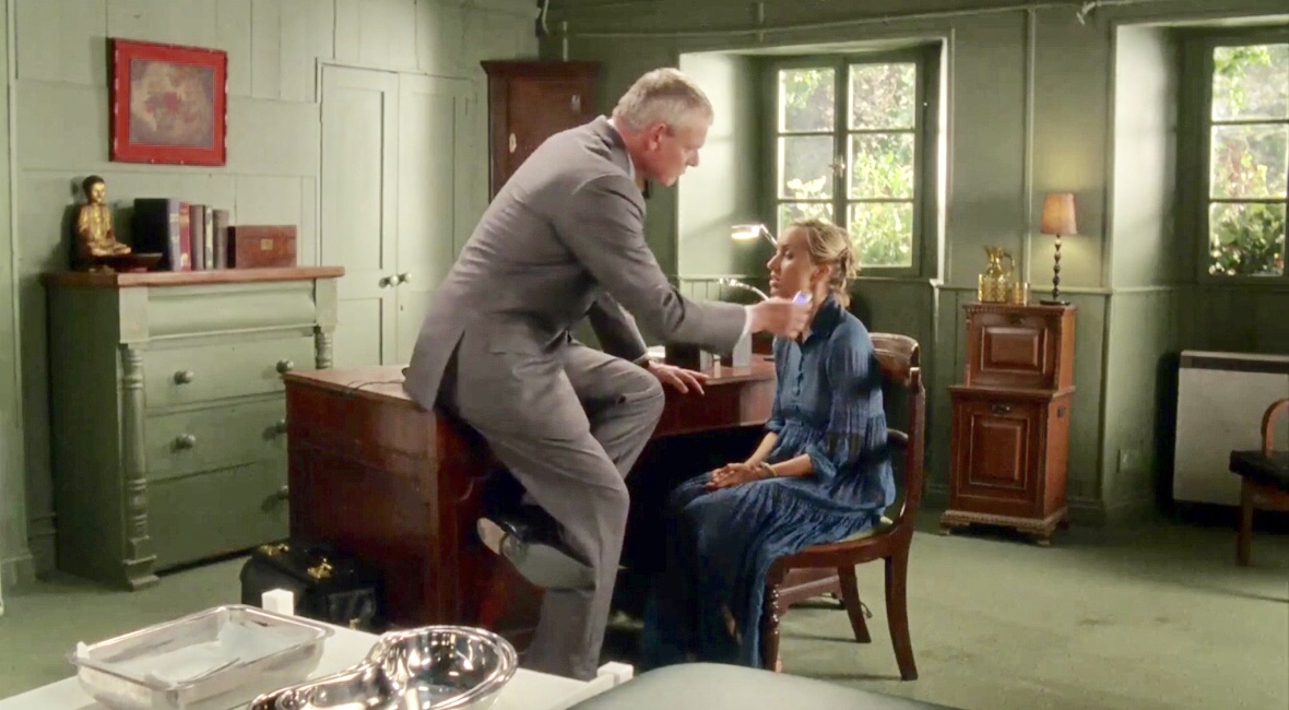 | In this series they occasionally moved things around. Most of the time only Martin's medical bag sat against the wall. A couple of times the step stool was moved there temporarily from the left wall. One time his rolling exam chair was there. In the scene where Louisa helps Martin hop into the room, the wooden chair has been moved over from the other side of the door to make room for the ultrasound machine. The one addition this series is a wall mounted hand sanitizer. (There's an identical one in the Waiting Room next to Morwenna's desk.) |
