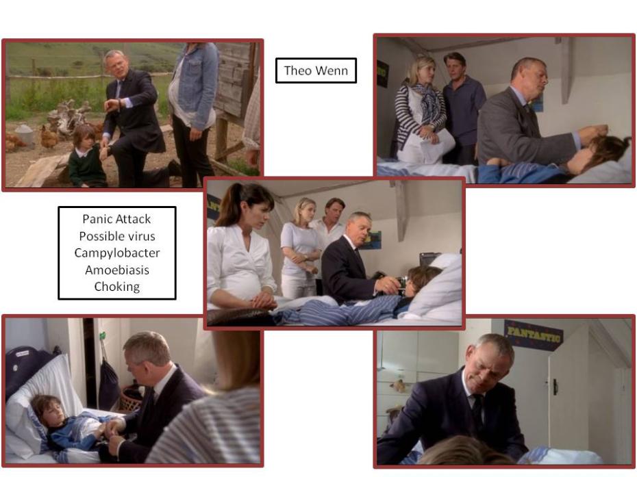 Louisa. We've asked Louisa to come by because we're going to need her statement regarding the incident. Uh, you asked me to drop these off. You never mentioned anything about that. I take it you're still intending to engage a solicitor. We've made a formal complaint to the police about false imprisonment. No! He was only in there for five minutes or so. Five? Four minutes then. Three. I don't really know. I wasn't there for most of it. So, it could have been longer? Is there any way we could speed this up? It's just that we have our guests arriving. Do you have any abdominal pain? What's that? Does it hurt there? Um. I need a stool sample. What is wrong with him? It's impossible to say until the test results come back. I'll, um, preemptively treat him for Campylobacter. I knew it. It's the bird feces. Bird feces, yes. But not necessarily from a chicken house. No. It was probably that other time he was exposed to bird feces. You're just protecting your aunt. And where were you when all this was happening? Standing there cheering Mrs Norton on? Toilet. I have no intention of protecting anyone. My relation to Mrs Norton has no bearing for my concern for your child's health. Antibiotics. Two in the morning. Two in the evening. Stool. Stool, um... Oh, give it to me. You'll only mess it up. You know, Martin is a very, very good doctor. You're carrying his child, aren't you? I don't see what that's got to do with anything,