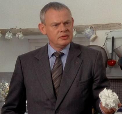 All right, Mrs, uh, Selkirk. What's the problem? I don't know why I'm here. I saw our Jim last night. You, drempt about your late husband. No, no I saw him. In the kitchen. Right. And he told me to come and see you. "You go see that tosser, Doc Martin." So, here we are. We? Me and Jim. He's sitting over there.