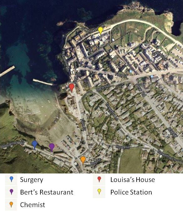 | Louisa's house in Series 3 is a small cottage on Fore St just up the hill from the school. In the show it is referred to as "White Rose Cottage" The cottage is actually called Sea Cove Cottage and is a holiday let. |