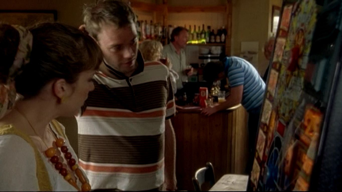 | Below are interior and exterior shots of The Golden Lion. The entrance to the pub is actually on Fore Street, which is the opposite side of the building from where we see people enter the Crab & Lobster from the Platt. Above you can see the three scenes filmed in the pub for Series 3. In E4, there is a scene with Pauline gambling in the pub and then later in the episode Louisa picks up a drink from the bar and sits out on the balcony where she observes Carrie Wilson leaving the surgery. In E5, Pauline is again gambling in the pub and Al is jealous seeing her with Mick. |