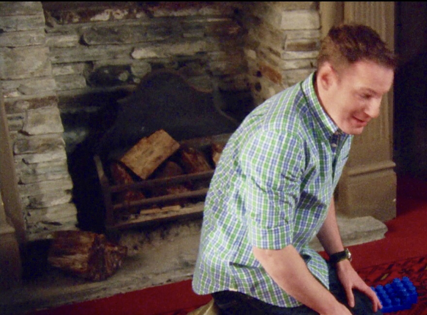 | Again this series we can only see the left side of the mantel, but we finally get a couple of good looks at the base, the iron grate and the firebox. The tribal art piece is on the left, what looks like a ceramic artichoke, and the wooden clock we first saw in Series 4. For the first time there is no painting hanging above. |