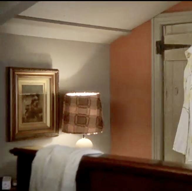 | There is no dresser on the wall between the wardrobe and the door this series, but the rectangular framed painting is still on the wall. The only time we see the lower part of the wall is in E6 and the flowered upholstered chair from the living room is there in that scene. |