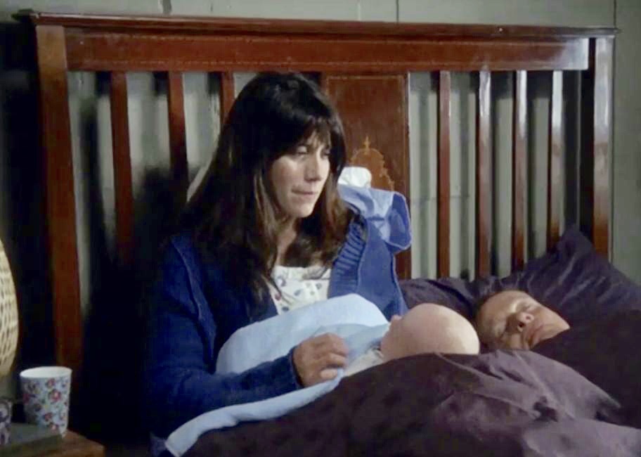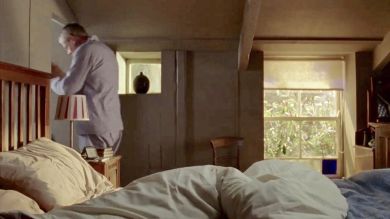 | This is the first series that there is a real, well used set for the upstairs. Martin & Louisa have the nice bedroom with the en suite bathroom. During this series James Henry's crib is in the room next to Louisa's side of the bed, so we don't see anything yet of the room across the hall which will become his room. We also have a few glimpses of the window in the hallway just outside the bedroom door. |
