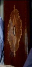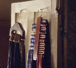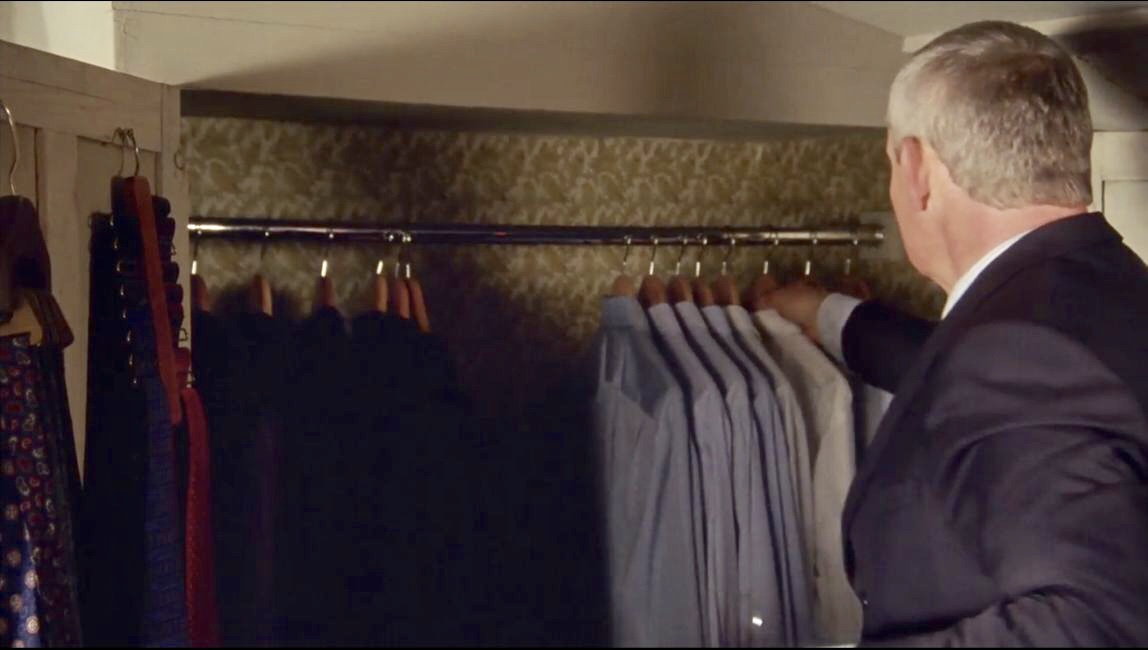 | This is our first really good look at the wardrobe in this room. In E1, Martin is getting dressed for the wedding and he has 2 tie racks hanging on the inside of the left door. At the beginning of E6, he is looking for a particular tie and this time we just see one of the tie racks and it's hanging on the inside of the right door. We also get a good look at the mustard color wallpaper with a pattern of birds perched on branches. |