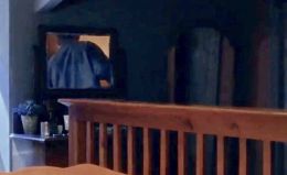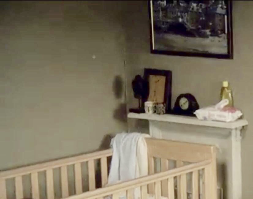 | The same dresser with attached mirror sits behind the door. Most of the shots of that area were pretty dark, so it was tough to identify anything familiar. The freestanding mirror was still in the corner. |