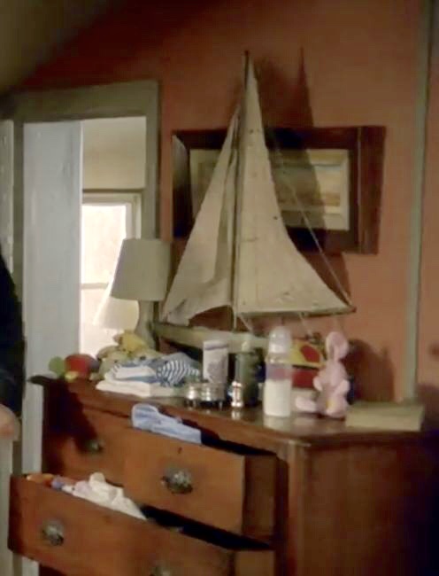 | Against the short wall next to the door is a large wooden dresser. There is a very large sailboat on top of the dresser and a small white lamp on the left side. The lamp is sometimes missing, so it might be the one that was seen on the dressing table - it seems to be a perfect match. There are also a lot of unidentified baby items all over the top of the dresser. On the wall above is a rectangular framed painting that is a pair to the one on the wall on the other side of the wardrobe. These two paintings were hanging as a pair in the Living Room in S4. |