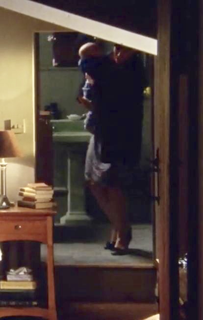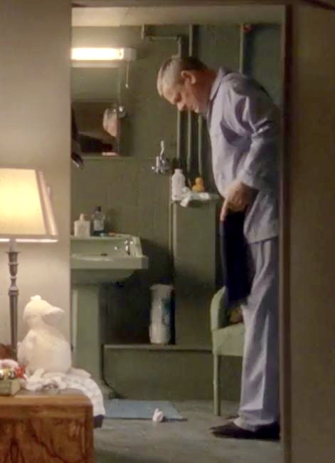 | Only a couple of shots from the bedroom this series. One shows the addition of a tall woven hamper next to the sink, and the other shows that the picture that was above the bathtub in S6 is now hanging above the towel bar. |
