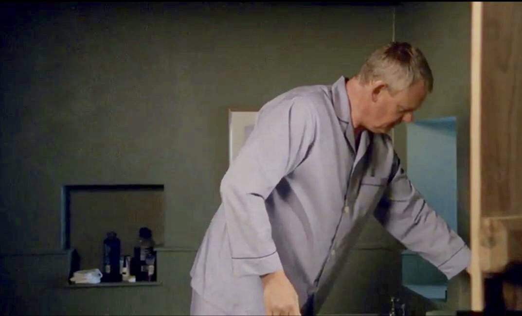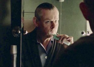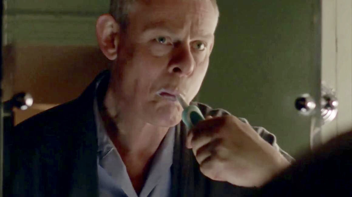 | In this very short scene we see Martin brushing his teeth at the bathroom sink. He hears a noise downstairs (Penhale's brother painting the Waiting Room) and heads downstairs. |