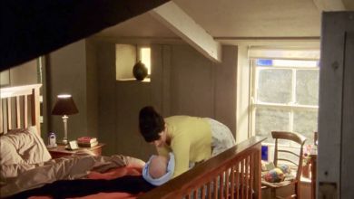 | Two different chairs were spotted by the window at different times in this series. The one with the mustard fabric back was in the Living Room in S7, and the wooden one has not been spotted before. For the first time, there is a different vase in the little window. This vase was in the Living Room in S7. |