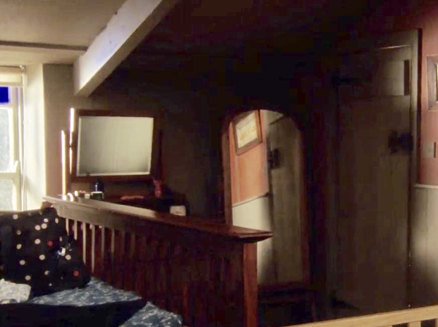 | We've seen the little glimpse of the hallway between Martin & Louisa's bedroom and James Henry's bedroom for a few series now. The only thing we knew was that there was a window between the 2 rooms with some accessories sitting on the deep windowsill. A couple of times, Martin exited his bedroom and turned to the right, so that was presumably the way to the staircase. But, in S7E1 while brushing his teeth, Martin hears the phone ringing downstairs and assumes it is Louisa. He runs out of the room, down the hallway, and trips down the first few steps banging into the wall on the landing before tumbling down the longer flight of steps. Although the screenshots are very dark, you can make out the turns he makes. He turns right out of the bedroom, down a short hall, then left, down another short hall, then right again - presumably onto the short flight of steps to the landing. In picture "C" you can see the 2 different wallpapers - the little bit of the one on the far right matches the wallpaper in the stairwell, so I'm guessing this starts the couple of stairs down to the landing. I found a picture someone had taken on the set, and it gives a nice view of this hallway. You can see the large painting on the wall (the scene of Port Isaac that has hung in several places in the surgery) and a small glance of the yellowish wallpaper that is on the wall before the more beige wallpaper of the stairwell. |
