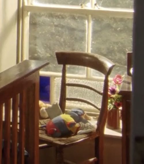 | There is a chair sitting in front of the large window - it's one that was in the Kitchen in S5. A tin pitcher holding flowers, and a stuffed animal are on the windowsill. The same round vase is in the little window. |