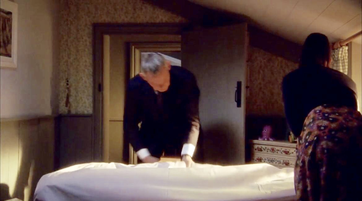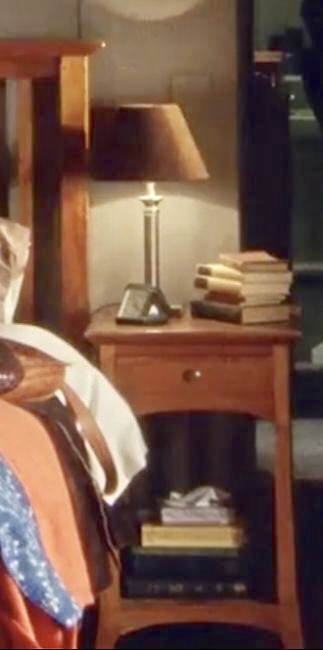 | The bed is the same, but there are new nightstands on both sides - and they may match (but its difficult to see Louisa's). On Louisa's nightstand is the same lamp and carved wooden box from S6. Martin has a new metal lamp with a red and white striped shade. His little travel alarm clock is still there. |