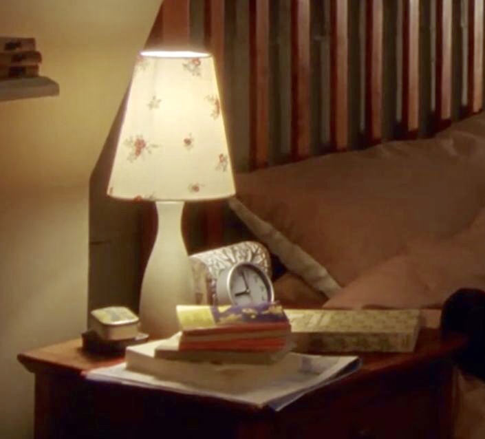 | The new bed is almost identical to the one from S5, but doesn't have the wide slat with the decorative detail. Like the previous bed, it has a tall matching foot board. Martin & Louisa each have a new nightstand, and they appear to match. Louisa has a very feminine lamp - white ceramic with a white lampshade with flowers. She also has a small carved wooden chest, a round alarm clock, a couple of decorative tins, and several books. On Martin's nightstand is a brass candlestick lamp with a red shade, a clamshell travel alarm clock, and several books. Martin's lamp was also spotted off and on in the Consulting Room and Living Room in this series - they may have a couple of them. |
