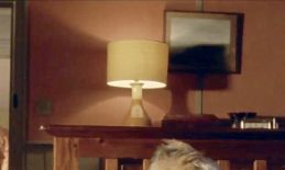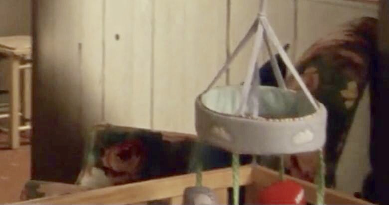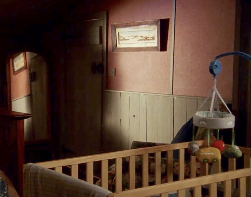 | This side wall is not often in the camera shot. While most of the walls are painted a beige color, halfway across this wall it becomes a salmon color with vertical beige wood trim. This salmon color continues on the wall on the other side of the wardrobe. Throughout the room there is wainscoting on the bottom half of the wall that is painted to match the beige walls. There is a dressing table along this wall near the wardrobe. Atop the table is a large mirror, a small white lamp, a small portable radio, and several other unidentified items. Two mobiles hang from the ceiling along this wall - probably something for James Henry to see as he lies in his crib. One is light orange butterflies and the other is white doves that hang in a circular pattern. We can also see a picture on the wall - it is the matching one to the rectangular painting on the wall on the other side of the wardrobe. These 2 paintings here hanging as a pair in the Living Room in S4. |