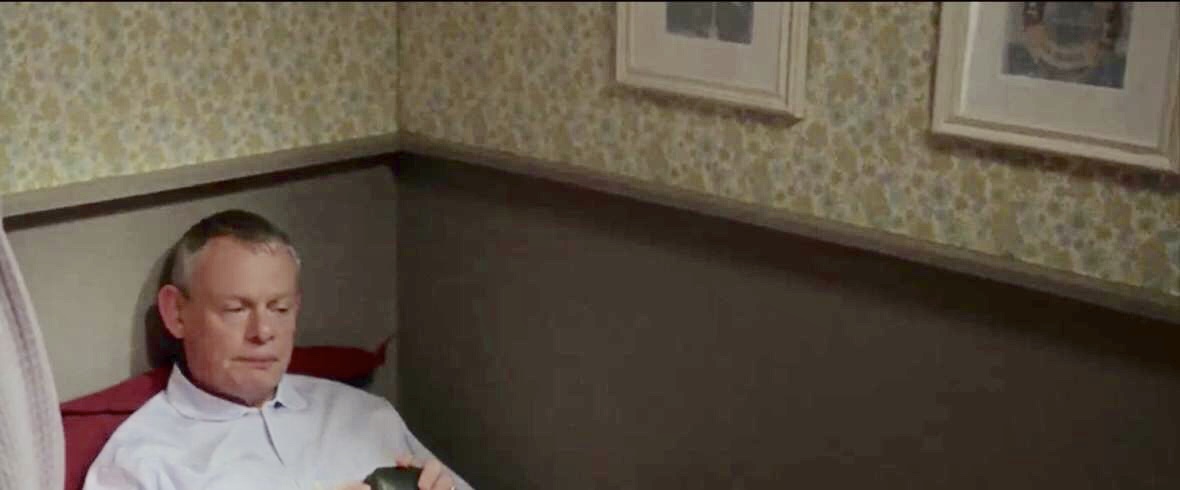 | There were 3 scenes filmed in this room in Series 2, but all of them were from outside the room looking in, so there wasn't much visible. In E1, Martin is putting on his jacket and hears Pauline and Al talking - he thinks they are talking about him and his possible interest in Louisa. You can see a window on the right wall, the light wood headboard on the bed, and the table to the right of the bed holding a lamp, and a blue bottle. There's an angled ceiling and the walls are made from rough boarding painted white. In E2, Peter Cronk comes into the room in the middle of the night to show Martin the rash he has developed. In this scene more of the bed is visible and there is a better view of the nightstand. There is also a glimpse of the door in the shot of Peter standing in the doorway. In E3, we see an almost identical view of Martin in the bed when he hears Wallace Flynt leaving him a message. I had found a picture from the set and was able to connect it to S2 because it has a nightstand on the left side of the bed that matches the one we saw on the right side. Also, in the shot of Peter in the doorway, there is a white box on the wall that matches the one from the set. So, it looks like they constructed a whole set - including that wardrobe that was never seen - just for these 3 very short scenes. |