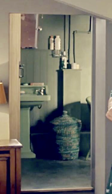 | The only full bathroom in the house (there is a small powder room under the stairs in the Waiting Room) is the en suite attached to Martin & Louisa's bedroom. There is one step up into the room from the bedroom. A bathtub sits on one side and on the wall facing the door is a green porcelain pedestal sink with a matching green toilet opposite (next to the door). The only visible areas for storage around the sink are a couple of wooden ledges built into the wall next to the sink. There is also a square cut into the wall above the bathtub for shampoo and soap bottles, and the windowsill at the head of the tub is also utilized. Interestingly, there is no shower on the tub - I guess Martin & Louisa take tub baths every morning? But then, I think we must consider that there is a shower room somewhere on that level that we just never see. A light green fabric chair sits next to the tub, a wooden changing table sits against the wall across from the tub, and in S8 we see a woven laundry basket next to the sink. |