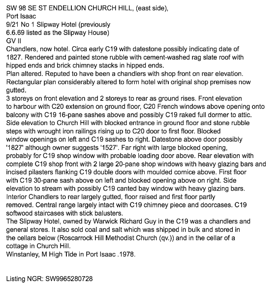 | The Slipway Hotel sits at the foot of Church Hill, with a large awninged patio facing the harbour. There is another entrance on the Church Hill side, up an outdoor flight of stairs. On the back of the building there are two large windows facing a small pass-through to Middle Street with the entrance to Greengates directly across. On the Middle Street side of the building (near the back) there is a large bay window hanging over the leat. |