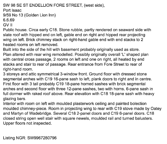 | The Golden Lion has been used as the town pub in Portwenn in every series. Every time you see someone entering the pub, it is through the opening in the building on the Platt called The Market House (just to the left of The Mote). There have been some series where other pubs outside of town were used for the interiors: Series 1 - The Golden Lion was used for all interior scenes with one slight exception. In the opening scene to Episode 6, Martin is staring at the mole on a sunbather just outside the doors to The Mote. The camera angle switches to Louisa sitting at the bar reading a newspaper, but interestingly, Louisa is sitting in the bar at The Golden Lion. Martin walks to the doorway of The Mote and carries on a short conversation with Louisa. Martin's shots were filmed from inside The Mote and Louisa's were filmed inside The Golden Lion. Series 2 - the interiors for all the pub scenes in this series were filmed in The Horseshoe Inn in Tresparrett. One exception was in Episode 5 when Louisa and Martin were to meet for a drink. We see Louisa at the bar in the Horseshoe Inn, but when she walks around a screen and onto the balcony she is on The Golden Lion balcony. In Episode 2, Al confronts Bert with the basket of purchased fish on the patio of The Golden Lion (next to the canon). For the Christmas Special after Series 2 they had several interior pub scenes that were all filmed in The Golden Lion. Series 3 - All interior scenes for this series were filmed in The Golden Lion. Series 4 - In this series they only had two episodes with scenes inside the pub. All of these scenes were filmed inside the St Mabyn Inn in St Mabyn. Series 5 - This year they were back inside The Golden Lion for the handful of pub scenes. In Episode 4, when Joe and Bert found themselves locked in the pub storeroom, it was a doorway at the base of The Golden Lion, right next to the patio. Series 6 - The only pub scenes are in Epsode 6. We see Malcolm in the pub drowning his sorrows and later Morwenna and Mike on their only date out on the balcony. Both scenes were filmed in The Golden Lion. Interestingly, when Morwenna and Mike are walking to the pub, they enter off the stone wall area on the Platt. In the following episode, Morwenna and Al are headed toward the pub and they are walking up Fore Street in the direction of the real entrance to The Golden Lion. |