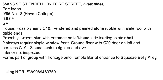 | Haven Cottage is a holiday let located on Squeeze Belly Alley. The doorway to the cottage is actually in the enclosed portion of the alley. There is another rental property in the newer part of the village also called "Haven Cottage". |