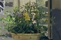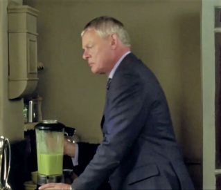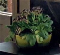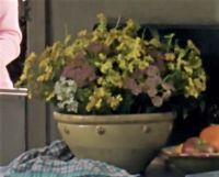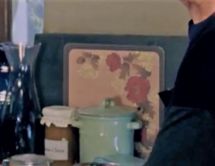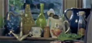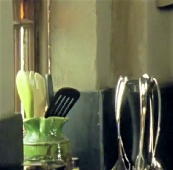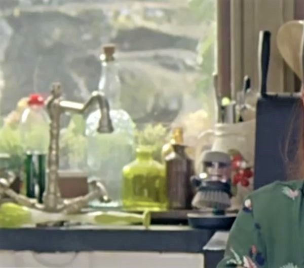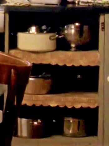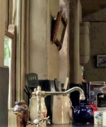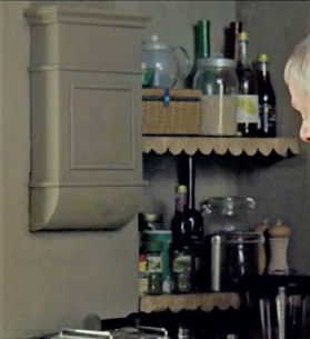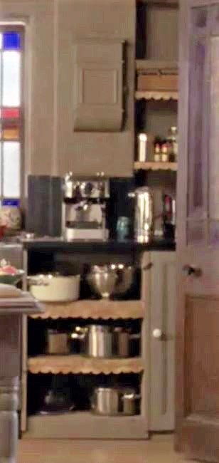 | The left counter holds a large bowl with a tall arrangement of dried flowers - although it disappears for Episodes 7 & 8. There are other small items that come and go on the counter, including the marble cheese board. The towel hook on the corner remains, and two additional blue decorative hooks have been added on the wall between the counter and the door. On the windowsill above the sink, some returning items are the two stacked grey pots, the warrior, the small apothecary jars, and a couple of the colored glass bottles. Additions are a tall clear glass bottle with a cork, a small pot, one of a pair that had been in the Waiting Room S5-S7, and a small hanging dish scrubber. On the window crossbar are three intriguing items - they look like they could be moth balls or tiny eggs? On the middle counter, the espresso maker only makes an occasional appearance - it stays mostly on the right counter. There is a new black knife block - and behind it, partly on the windowsill, are the two white pitchers filled with utensils. There are also several new mint green items - a short and a tall canister, and a rack with hanging utensils all with matching mint green handles. This rack occasionally moved across the stove to the right counter. The painting on the wall above is unchanged from the previous series. The items on the windowsill above the stove are mostly unchanged from the previous series - the green pitcher, the painted glass bottle, the small covered pot. There is also a small brown glass bottle, and in a couple of scenes, the matching small pot that we see in the other window - in one shot you can see both of them. On the right counter is the espresso maker (most of the series), a new small black toaster, a new silver electric kettle, and the woven basket still on the top shelf. |