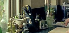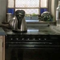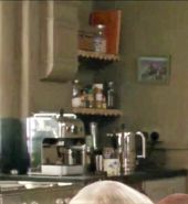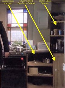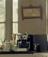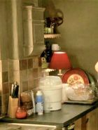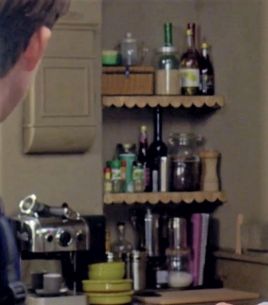 | Starting on the left counter, there is a chrome dish drying rack, a knife block, and sometimes we see cutting boards leaning against the wall. The sink has a nice tall chrome faucet, and behind the faucet there is a chrome rack with cleaning utensils, a row of succulent plants on the windowsill, and a small framed piece of stained glass on the right leaning against the window. On the middle counter, in front of the window is a container of cooking utensils, a red timer, a small decorative plate leaning against the wall, and the items that Martin uses to brew his coffee. It includes a lucite water filtration pitcher, a metal canister holding the coffee grounds, and a Moka Pot stovetop espresso maker (He finally gets a countertop espresso maker in S3). Above this counter is wall space that usually has some type of art. In this series there is a small B&W beach print, and a wooden towel holder is mounted on the wall below. Later in the series, the picture was removed from the wall and set on top on the radio on the counter to the right. On the stove is a very modern stainless tea kettle and another one that might be an electric kettle. On the widowsill are a couple of unidentified items and a few more succulent plants. On the right counter are various bottles that may contain oil, vinegar, sherry, whiskey (?) An antique radio sits on this counter and there looks to be some type of metal rack on the counter in front. At the far end (in the corner) are various unidentified items with glassware and serving ware on the shelves above. The shelves below the counter seem to house pots and pans and round bamboo steamers. |