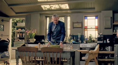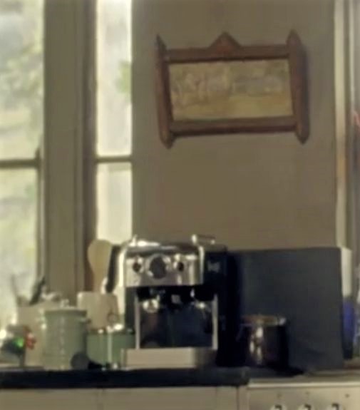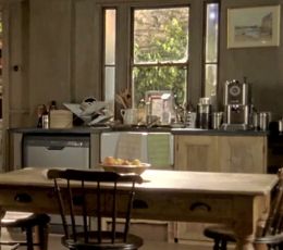 | In this series, the dishwasher has been replaced with an under counter fridge, and there is another new stove. The dishwasher from S4 has been moved into the pantry. The left counter still has the chrome dish drying rack and there are also an assortment of cutting boards, serving trays and dishes, and a green pitcher. On the windowsill above the sink is a cute flat wooden chicken leaning against the window. There are a couple of stacked grey plant pots on the left, a pair of short green glasses (votive lights?), a silver canister holding utensils, a red painted tin canister, a white pitcher, and a few small unidentified items. On the crossbar of the window is a small metal bird that was first seen in the Consulting Room in S3. The middle counter has another new, very fancy, commercial style, black espresso maker. The electric kettle is nowhere to be found, but a counter paper towel holder and a chrome toast rack are there. On the wall is an antique photo of the lifeboat being pulled through Fore Street in Port Isaac. This photo was in the Living Room in S2. On the windowsill above the stove is an egg-shaped chrome timer and the two black & silver tumblers that were in the Consulting Room S1-S3. In a couple of scenes, a small black radio sat in the middle of the windowsill. Hanging from the lock on the window crossbar is a small red wooden heart. On the right counter is the knife block, a red Venetian glass candle holder, a large white baby bottle warmer, a white pitcher and cruet, a round orange tray leaning against the side wall, and a brass stick lamp with red shade. |