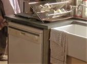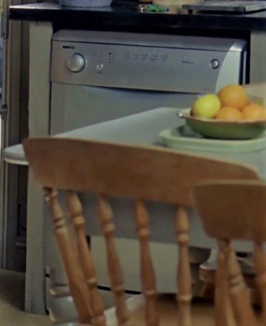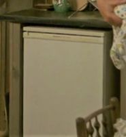 | Starting from the left is a wooden cabinet that has open shelves on the left and a single door on the right - although it only looks like that in S2. In S3, it is cleared out and frames a white dishwasher. But that only lasts one episode, because in Episode 2, part of the storyline is that Martin is installing a new, silver dishwasher. But then, in S4, there's yet another new white dishwasher. For S5, it's replaced by an under the counter fridge - they used a similar, but different small fridge in the pantry in previous series. Then in S6 (and continuing through S9), a dishwasher is back in this spot - another new silver one. (A new tall fridge is on the other side of the room.) |
