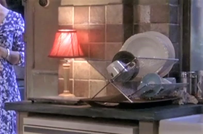 | The change in this series is that a tall tile backsplash has been added across the back wall. There is also yet another new dishwasher - another white one - and a new stove. The chrome dish drying rack remains on the left counter, along with a short wooden candlestick lamp with a red shade, and a marble cheese board. At the beginning of the series, the knife block and the white pitcher holding kitchen utensils are there, but they move back and forth to the other end of the counter. Starting in Episode 4, the knife block remains on the middle counter and the utensils remain on the right counter. On the windowsill above the sink, on the left are a couple of the silver coffee canisters and a small shallow bowl. On the right is one of the brown bowls that contains some round items. Starting in Episode 4, the brown bowl disappears and there are two glass vases with painted flowers, a short red & gold metallic looking vase, and a pair of canning jars that I suspect hold coffee grounds and sugar. On the crossbar of the window is a miniature mantel clock. On the middle counter is another new silver espresso machine, the black electric kettle, and the knife block. In this series, on the wall above is a large landscape painting. On the windowsill above the stove are a pair of glass jars holding what looks like pasta and grains, a couple more of the silver canisters, and what appears to be a seltzer bottle? The little metal piece that looks like it might be a snail has moved from the crossbar of the left window to the crossbar of the right window. The right counter has the white pitcher of utensils most of the time, but in an early episode had a red cup filled with pens. There's also a wooden tray, some glass jars containing maybe flour or grains, a rectangular lidded woven basket, an antique radio, and a tall lamp with a red shade. |