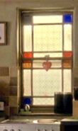 | The Back Right Corner of the Kitchen is the area between the hall door and the counter that stretches across the back of the room. There are pictures hanging on this wall in some series and the wall is sometimes blank. Because the hall door is usually open, it sometimes blocks the view of pictures hanging behind. In this series, the drawing of what looks like a teacup, but with a clown face (?) hangs above the electrical outlet. Starting in E6, the small painting appears below the cup picture. |
