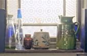 | On the left counter, the large ceramic planter is there from last series. It is there in Episode 1, disappears for a couple of episodes (it appears in the pantry in Episode 2) and then is back on the counter in Episode 4 and remains there the rest of the series - although the plants in it change slightly as the series goes on. In Episode 2 and Episode 3 there are 2 completely different plants sitting in that space. Also usually on this counter are the wooden salt and pepper grinders, the toast rack, a marble cutting board, another marble cutting board leaning against the wall, 2 tall amber tumblers, a small green glass covered jam pot, and 2 potted succulents. The 2 blue dish towel hooks remain on the wall next to the counter. The stainless dishwasher is the same one that has been there since S6. On the windowsill above the sink there are several new colorful bottles. Two are vintage glass bottles, one in the shape of a grape cluster and the other in the shape of a fruit basket. I found photos of a couple of similar bottles online. There is also a light green wine bottle, one of the brown apothecary jars holding the dish scrubber, a stoneware pitcher (holding utensils) that has been there since at least S6, and a tall cobalt blue pitcher. On the window crossbar are a skinny starfish and two glass bottles. In some shots we can see those 3 mysterious items from last series that look like mothballs? On the middle counter, are a couple of tall glass bottles, a fabric covered jam jar, a light green covered glass jar, the butter keeper, electric kettle, and a decorative cork place mat leaning against the wall. Hanging on the wall above is the small landscape in the tramp art frame that has been there since S7 The windowsill above the stove includes two items that have been there since S7, the tall green ceramic pitcher holding utensils and a smaller ceramic lidded jar. There are also a couple of tall glass bottles and a couple of spice bottles. On the right counter is a new stainless hanging utensil holder (the one last series held utensils with light green handles), the same espresso maker that Martin has had since S7, the metal coffee canister, and several assorted bottles. The blender is seen on this counter in several episodes. On the shelve above and below are the same assortment of bottles that we have seen every series. The woven basket still sits on the top shelf. |